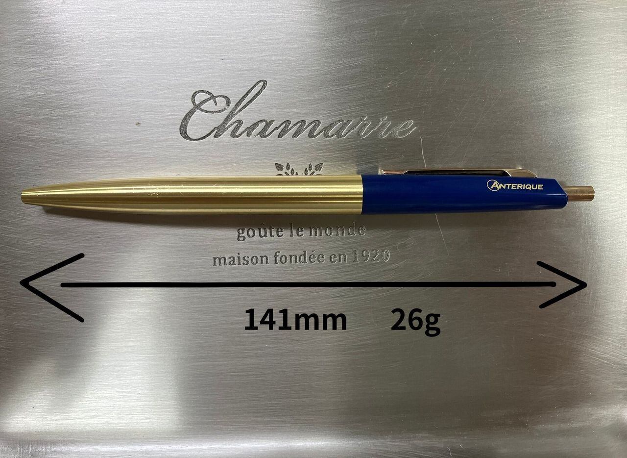 筆感:油性ですが独自技術で水性インクのような、なめらかな書き味です。細身で短めのボディはポケットや手帳との相性がよく、真鍮のグリップは適度な重さで持ちやすいです。インクはすぐ乾くので、筆圧強く書いてもにじみ、裏写りしにくいです。