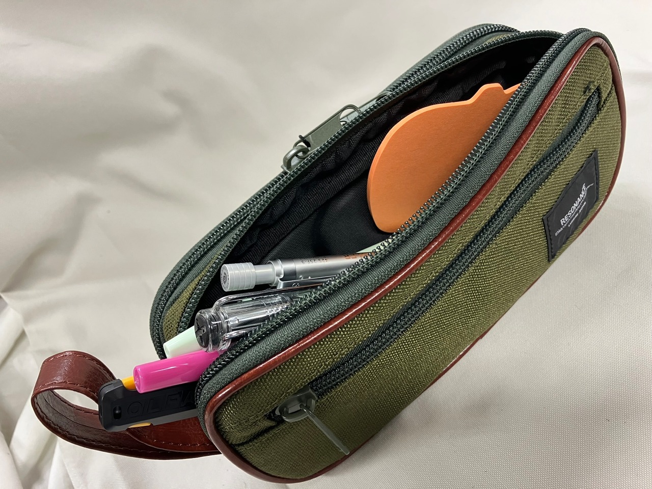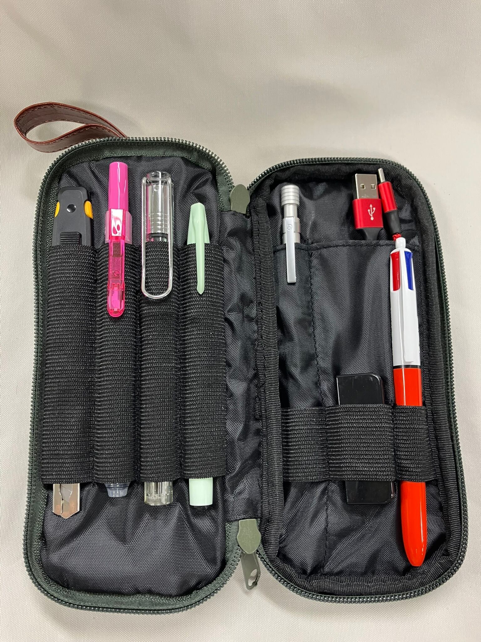 落ち着いたカーキは、ミリタリーやカジュアルなテイストを好みつつ、機能性を求める方に最適です。メイン収納に加え、ペンをホールドするゴムループ、小物用のポケット、薄いモノを収納できるサイドファスナーポケットを備えた大容量設計。文房具を機能的に分けて収納でき、取り出しやすく、整理効率を格段に向上させます。