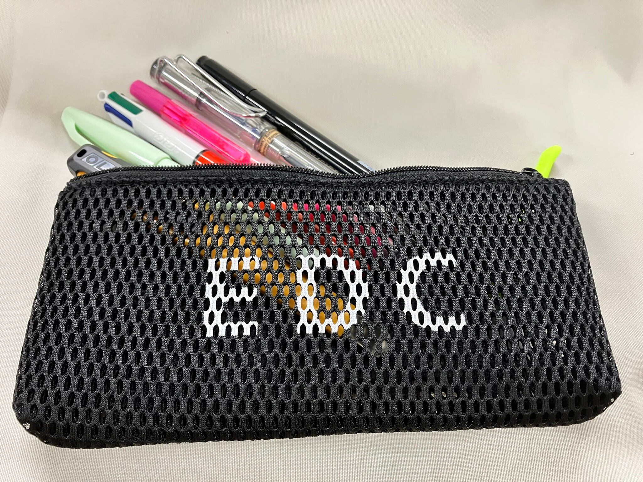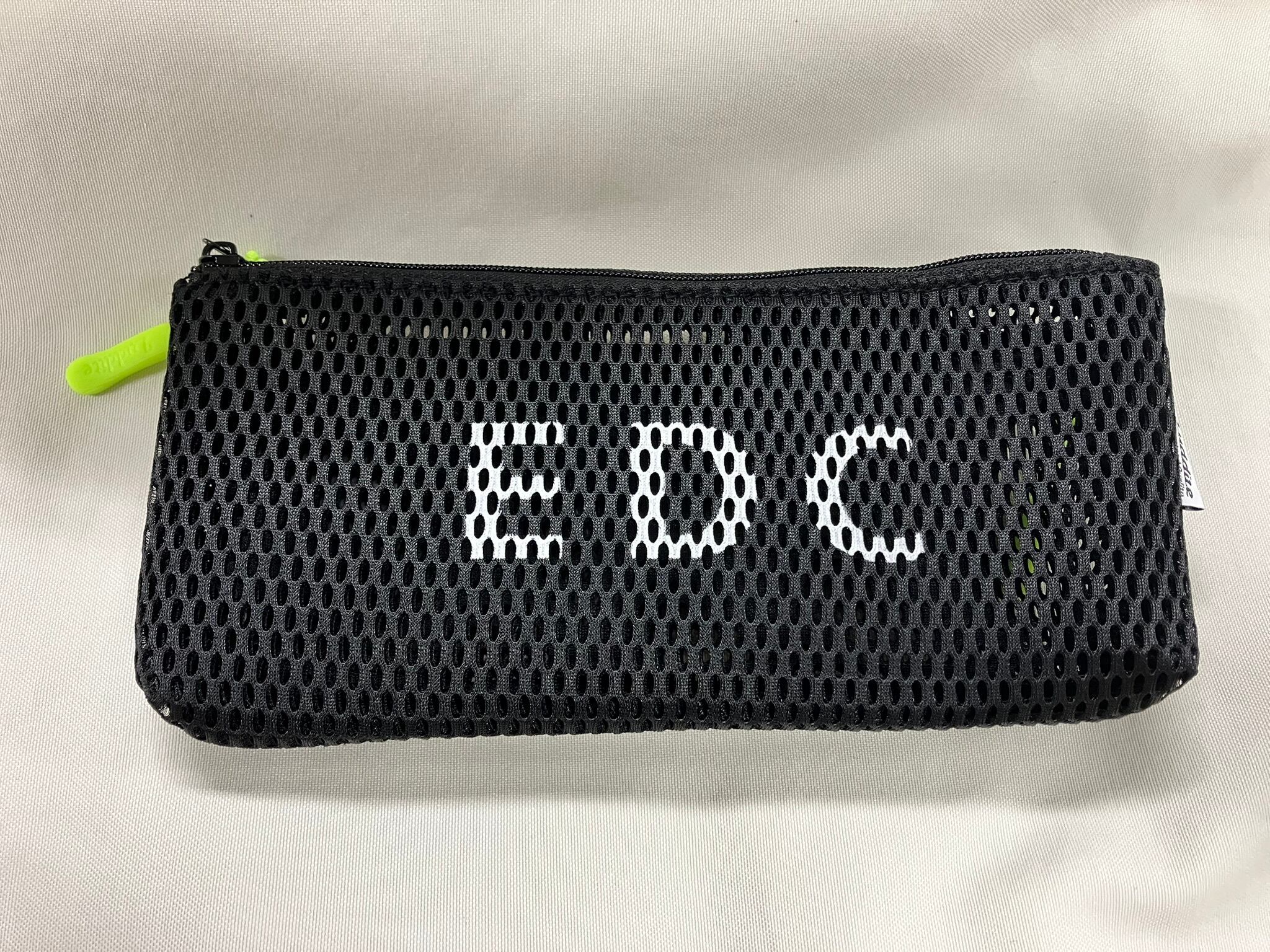 W200×H90×D20mmのフラット設計は、カバンの中でかさばりにくく、インナーバッグとしても活躍。素材はポリエステル100%で、さらりとした手触り。ブラック(BK)カラーにEDC(Everyday Carry)のワンポイントロゴが映える、スポーティーでシンプルなデザインです。筆記具の収納はもちろん、充電ケーブルやモバイルバッテリーといったガジェットケースとしてもマルチに活用できます。
