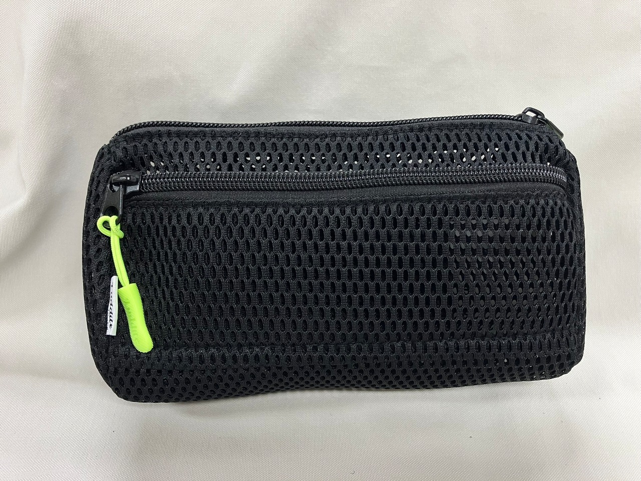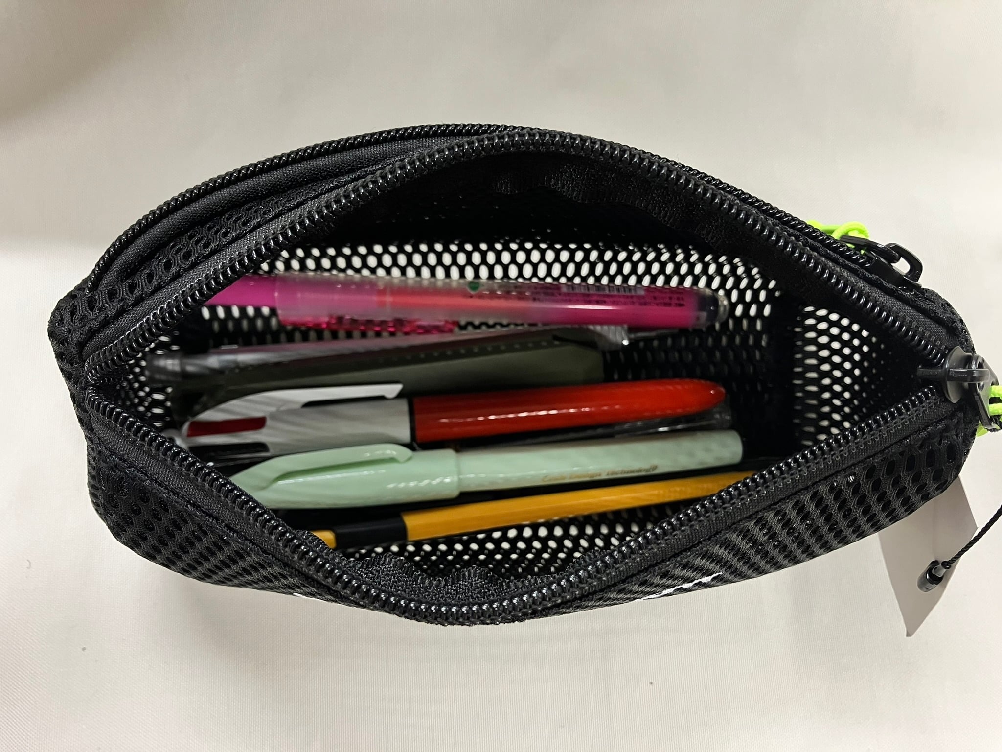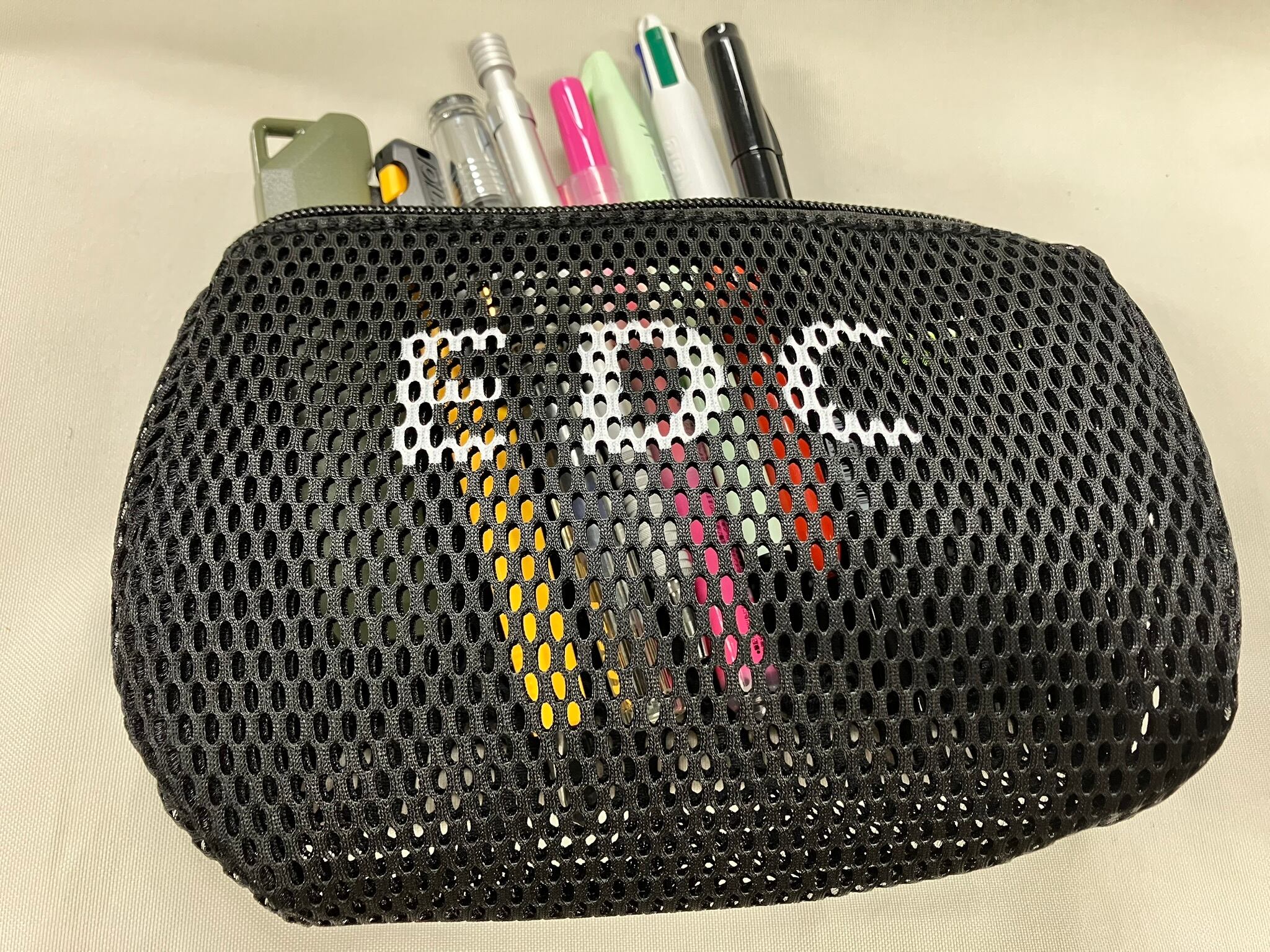 透け感のあるメッシュ素材(ポリエステル100%)により、軽量でありながら耐久性も高く、中身が外から確認できるため、筆記具や小物の管理がしやすい点が大きな魅力です。