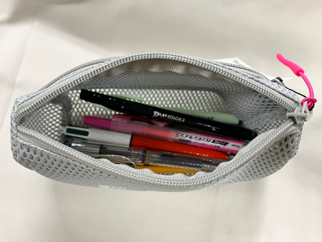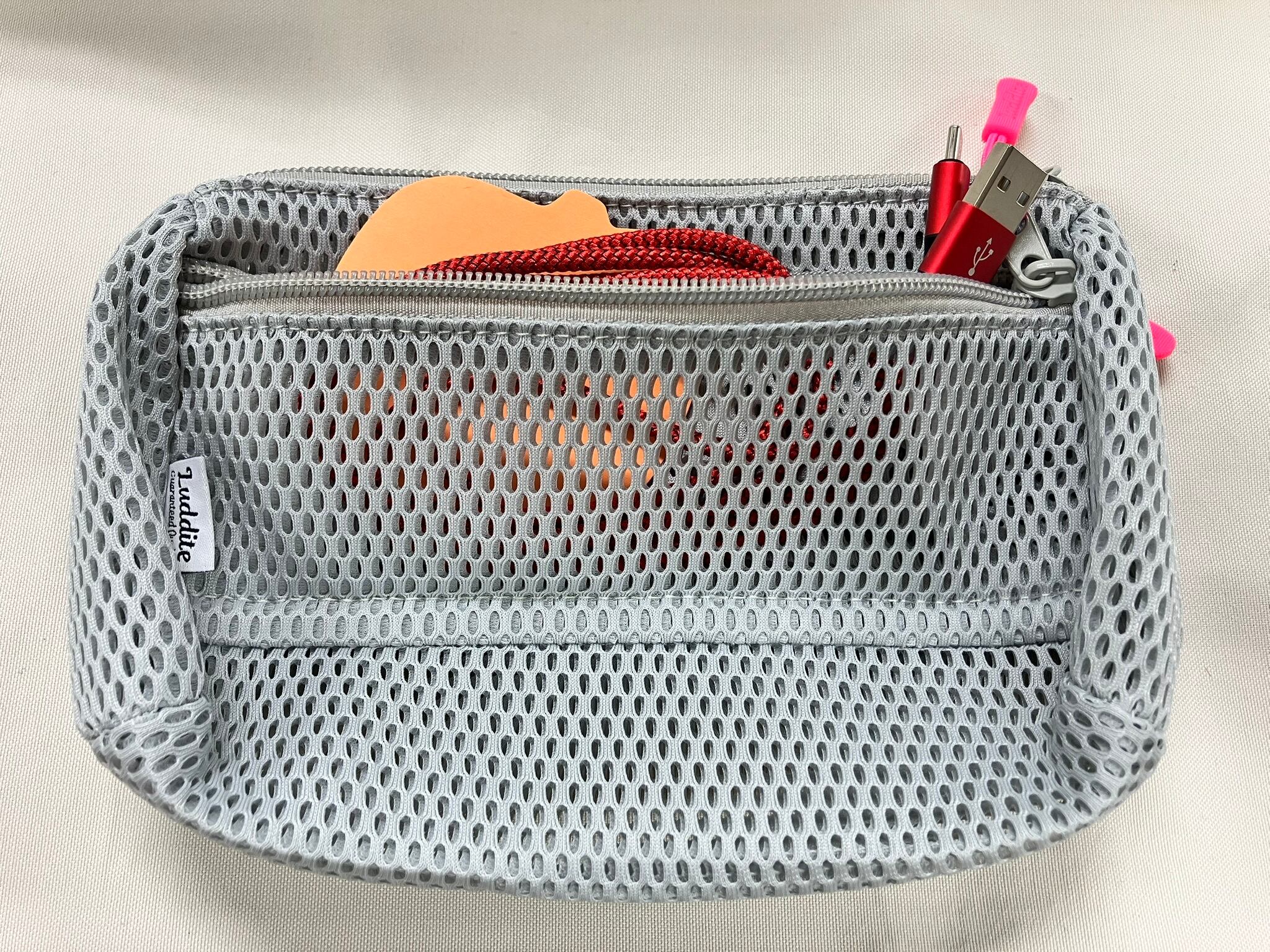 頑丈なメッシュ素材(ポリエステル100%)とボックス型の大容量(W200×H90×D60mm)により、ペンやガジェット類をたっぷり収納可能。特筆すべきは、中身が透けて見えることによる高い視認性です。探し物がすぐに見つかるため、在宅ワークやカフェ作業といったモバイルワークの効率を格段に高めます。