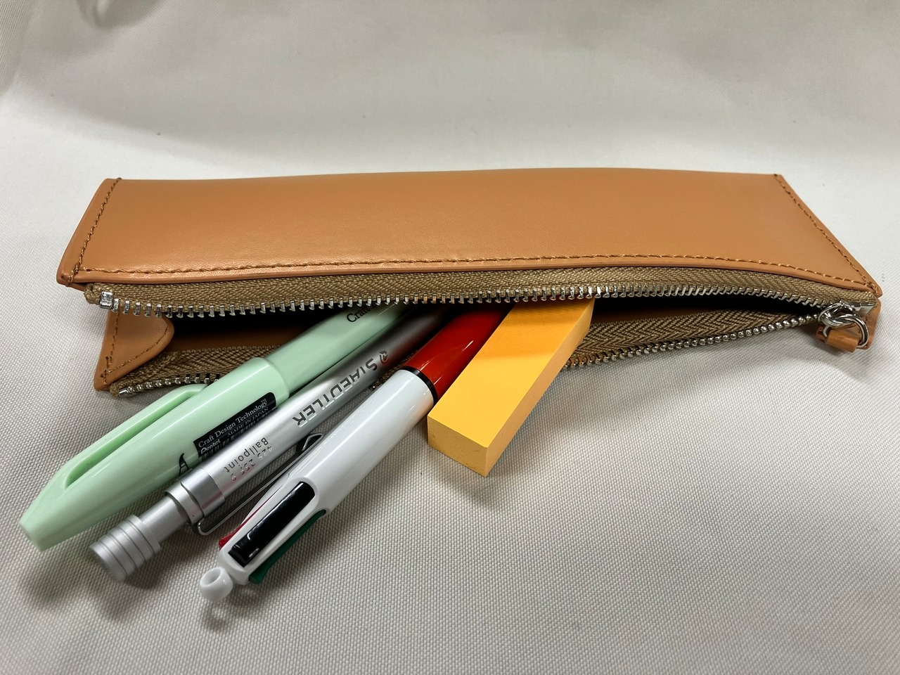スリムな形状(W196×H55×D20mm)は、モバイルやノートと一緒にスマートに持ち運ぶモバイルワーカー・学生に最適。片マチ構造で開けやすく、必要最低限の筆記具を上品に収納。