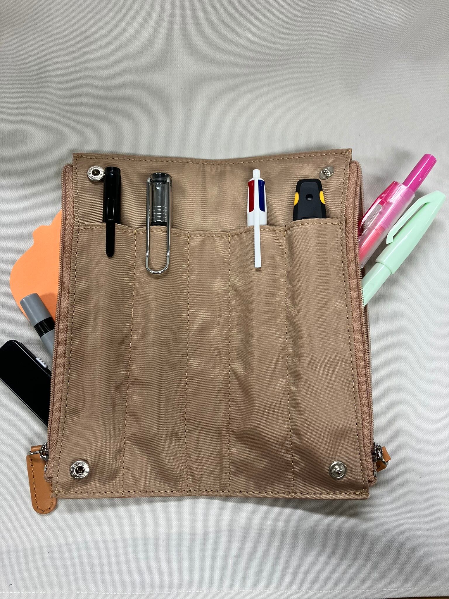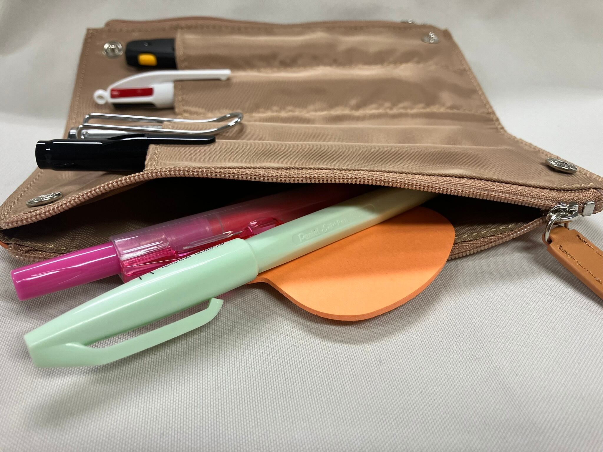 このペンケースは、文房具屋さん大賞デザイン賞を獲得した機能美が特徴です。内装には大切なペンを保護するための個別収納スロットと、消しゴムなどの小物を仕分けられるファスナーポケットを装備しています。
