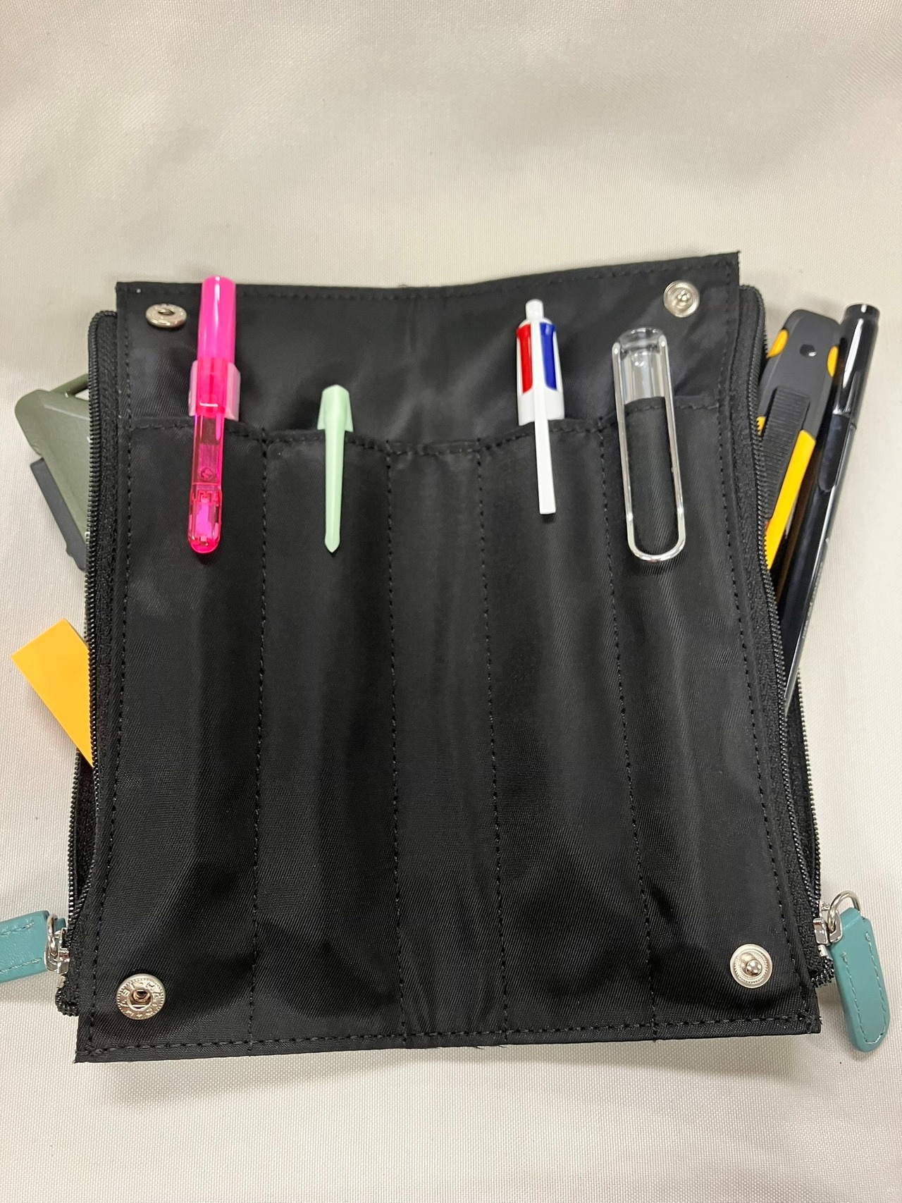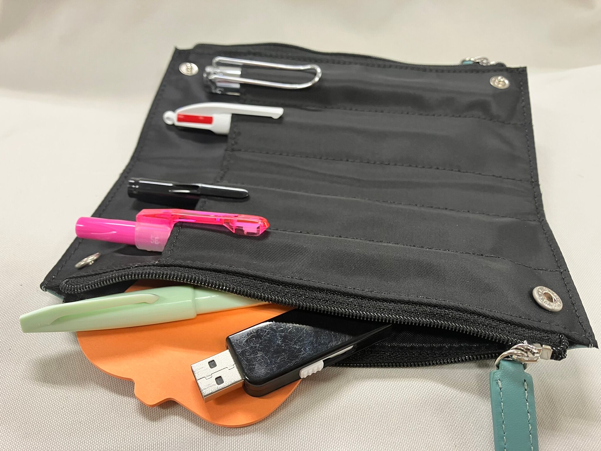 文房具屋さん大賞2025 デザイン賞に輝いたシリーズの製品として、機能性も抜群です。W190×H80×D20mmの本体には、大切な筆記具を保護する個別収納スロットと、小物を整理するためのファスナーポケットが設けられています。
